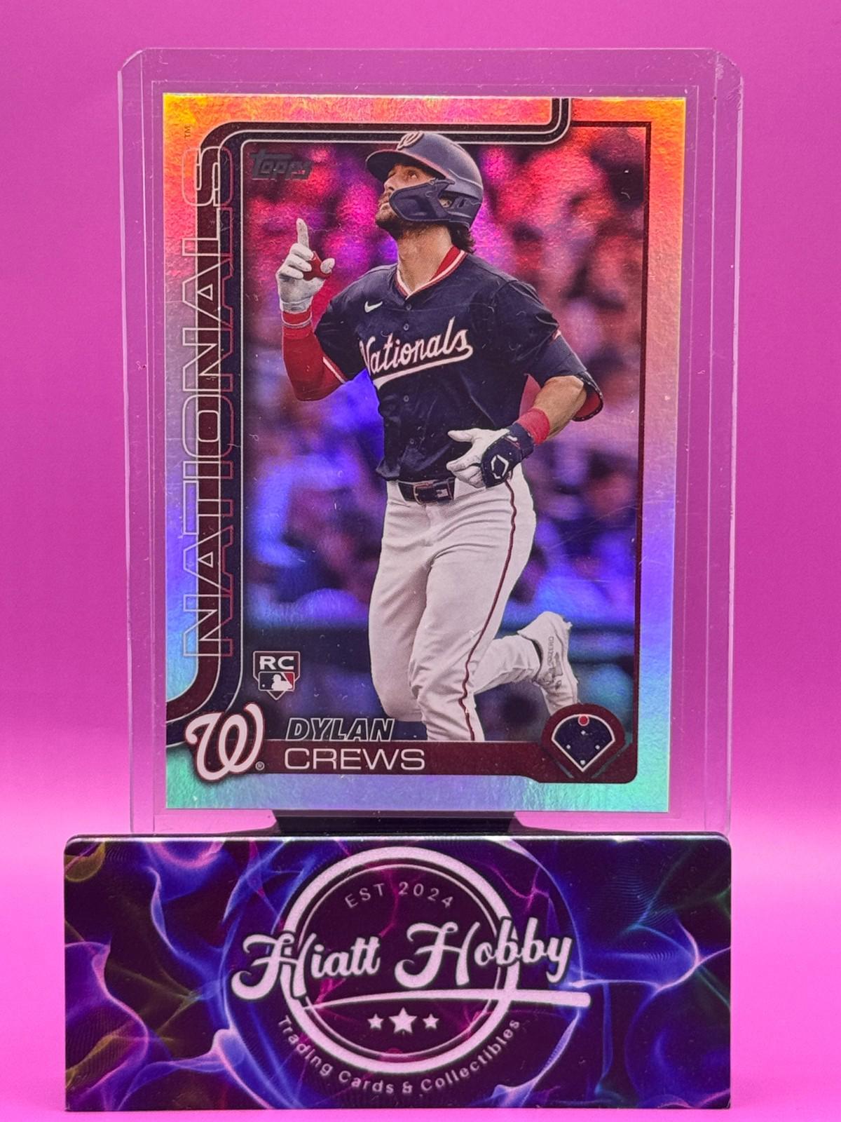 The product is a 2025 Topps Series 1 baseball trading card featuring Dylan Crews of the Washington Nationals. This particular card is a Rainbow Foilboard parallel variety, showcasing Crews in his Major League Baseball career. Manufactured by Topps in the United States, this original card is part of the 2025 Topps Baseball set and is a sought-after collectible item for baseball fans and card collectors alike.