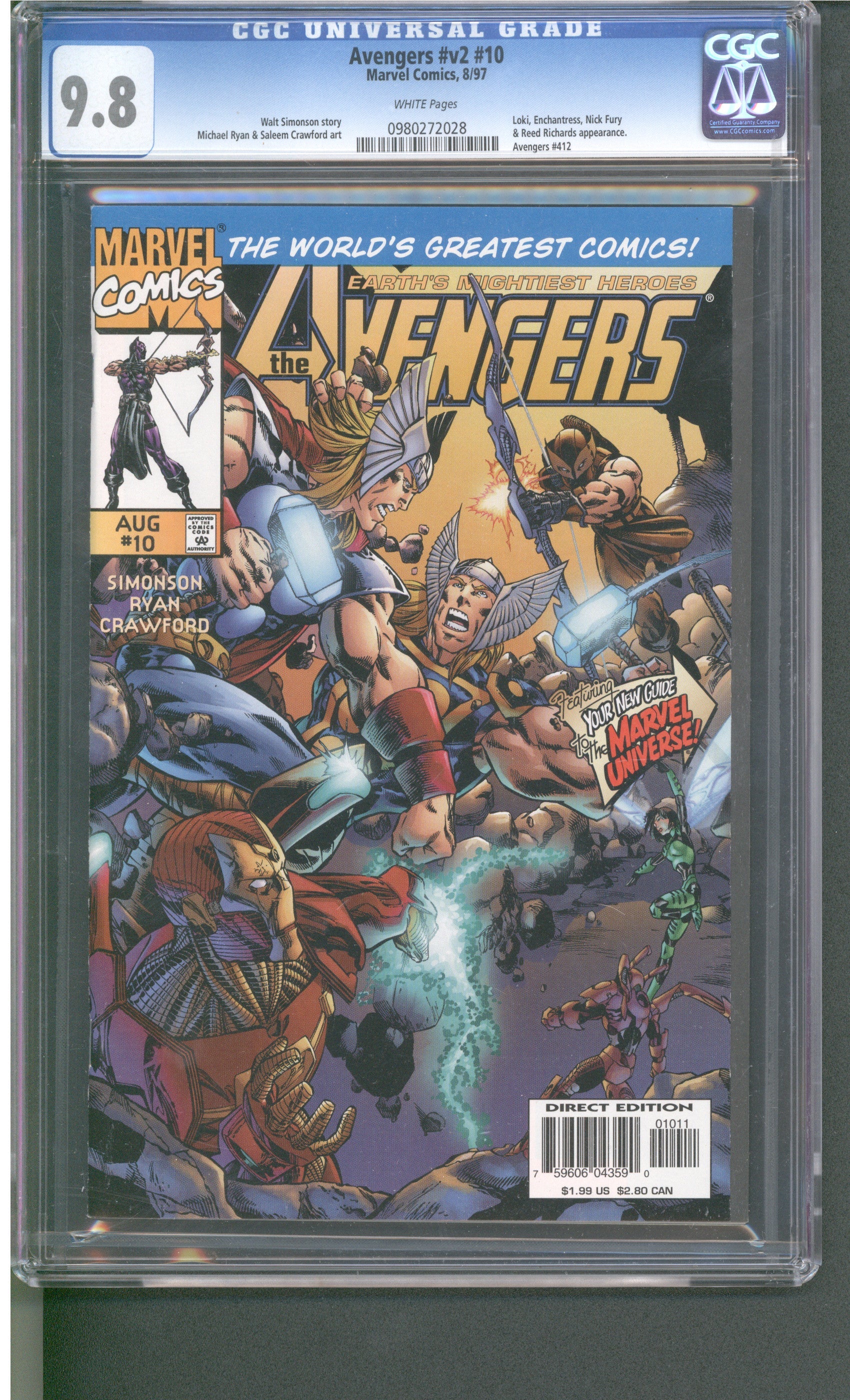 Avengers #v2 #10 from 8/97 offers a glimpse into the era's iconic storytelling. Featuring avengers #412, loki, enchantress, nick fury &, reed richards appearance., this issue is a must-have for collectors. Add this CGC 9.8 graded comic to your collection today!