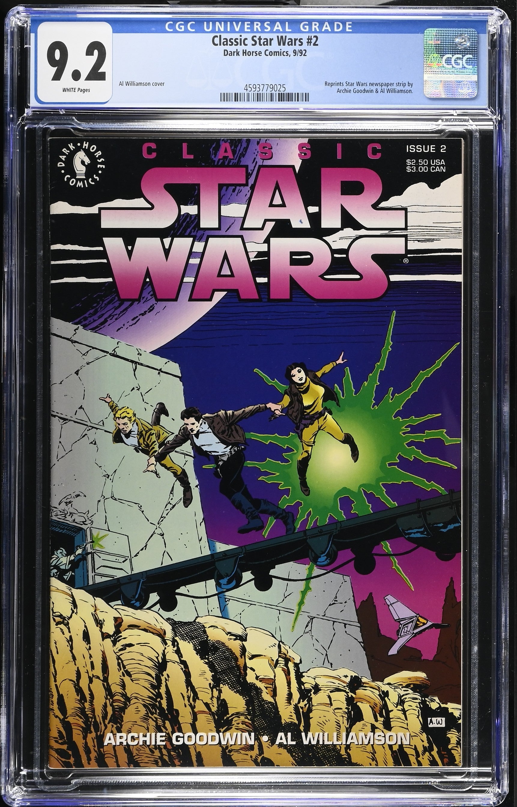 Classic Star Wars #2 from 9/92 offers a glimpse into the era's iconic storytelling. Featuring reprints star wars newspaper strip by, archie goodwin & al williamson., this issue is a must-have for collectors. Add this CGC 9.2 graded comic to your collection today!
