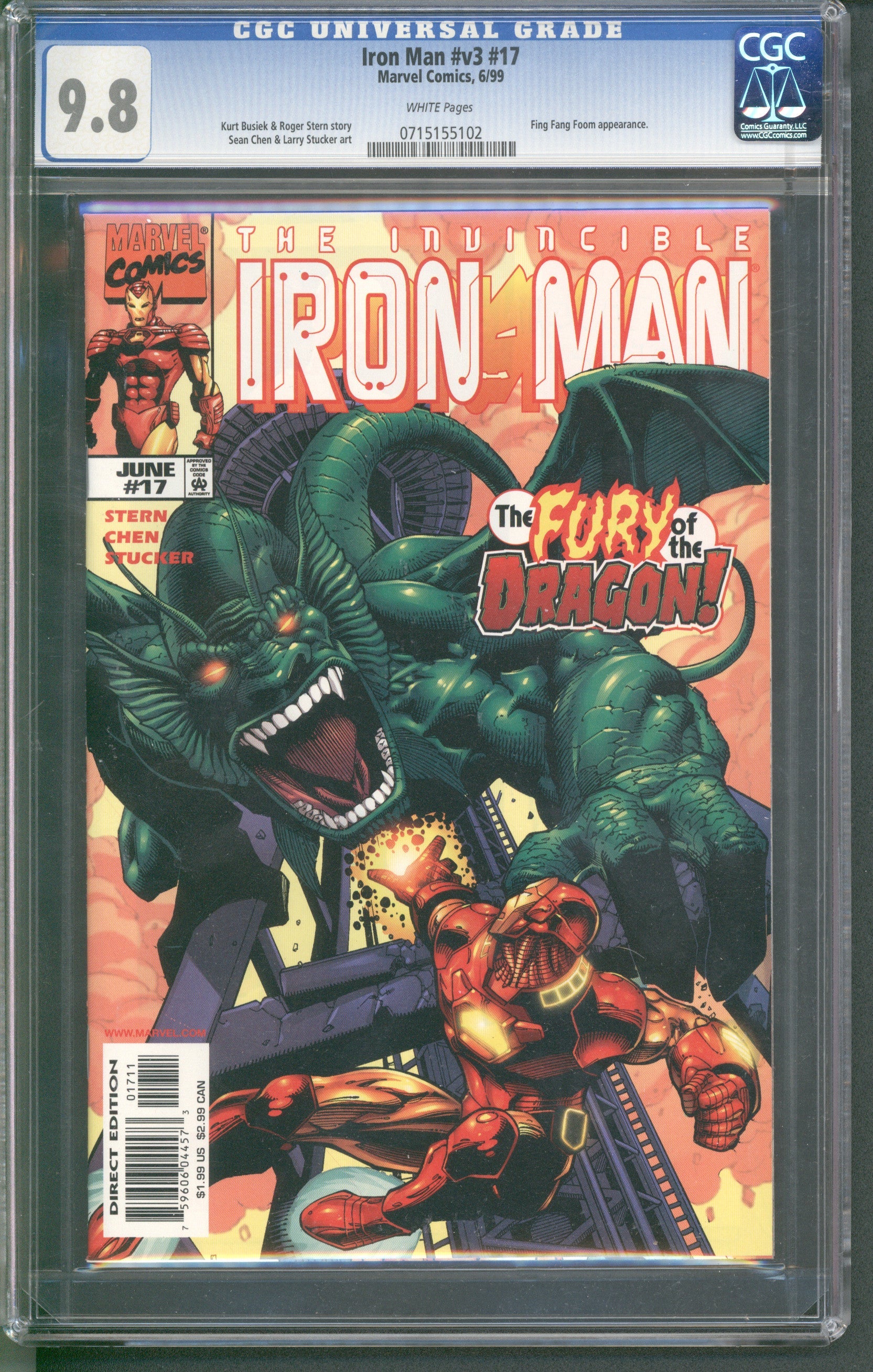 Iron Man #v3 #17 from 6/99 offers a glimpse into the era's iconic storytelling. Featuring fin fang foom appearance., this issue is a must-have for collectors. Add this CGC 9.8 graded comic to your collection today!
