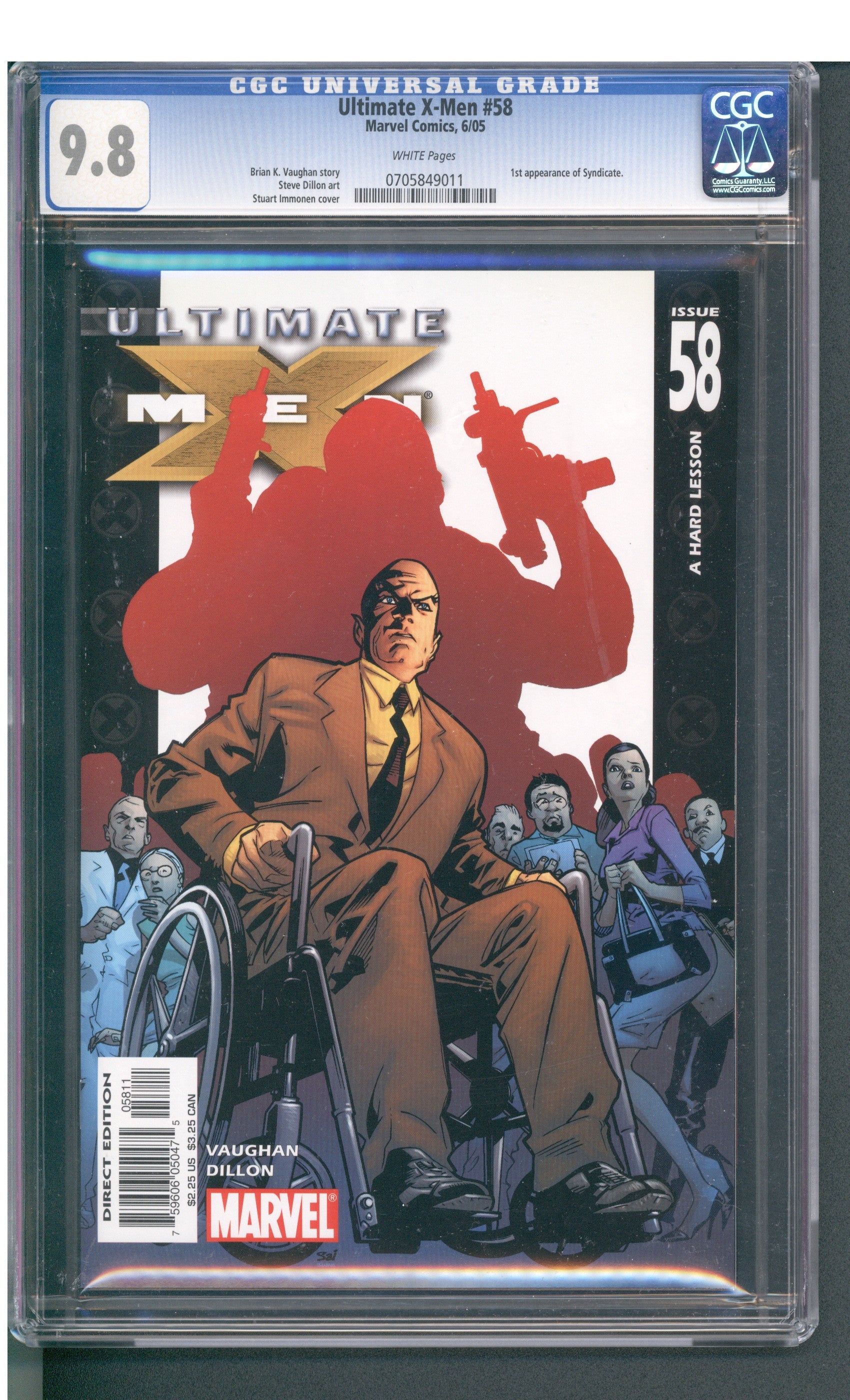 Ultimate X-Men #58 from 06/05 offers a glimpse into the era's iconic storytelling. Featuring 1st appearance of syndicate., this issue is a must-have for collectors. Add this CGC 9.8 graded comic to your collection today!